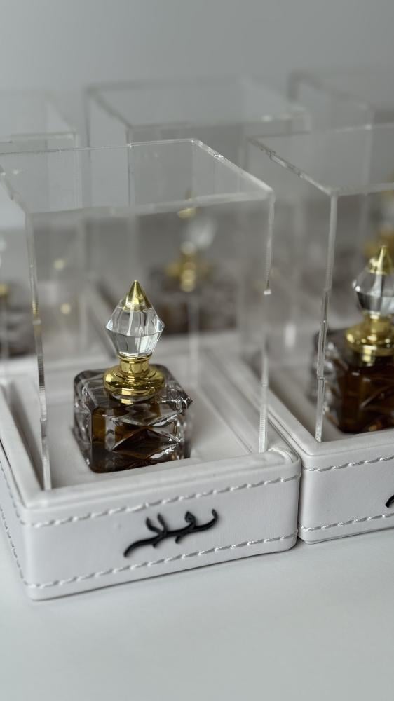 بوكس جلد يضم من الداخل اختيار من تولة دهن عود بتعبئة فاخرة، داخل زجاج كريستالي بغطاء thikrahluxury