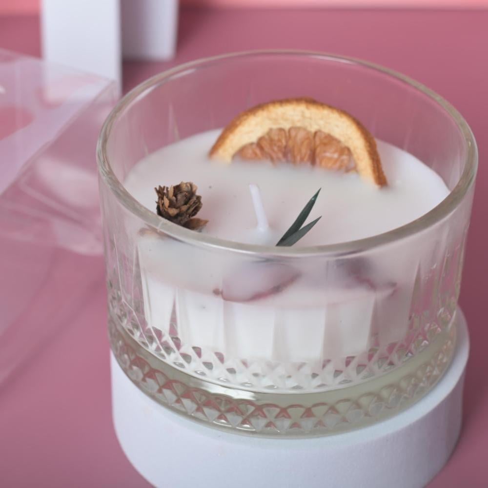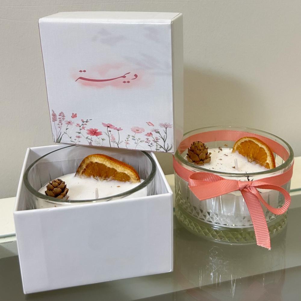 شمعه زجاجيه معطره برائحة البرتقال ... ذات جوده عالية وشكل انيق يضفي لجمال المكان .روعه وفخامه